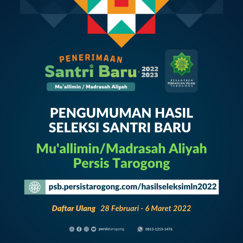 Hasil Seleksi Santri Baru Mu’allimin/MA 2022-2023 GARUT – Alhamdulillah seleksi penerimaan santri baru Mu’allimin/Madrasah Aliyah Persis Tarogong tahun pelajaran 2021/2022 telah dilaksanakan pada Ahad, 20 Februari...