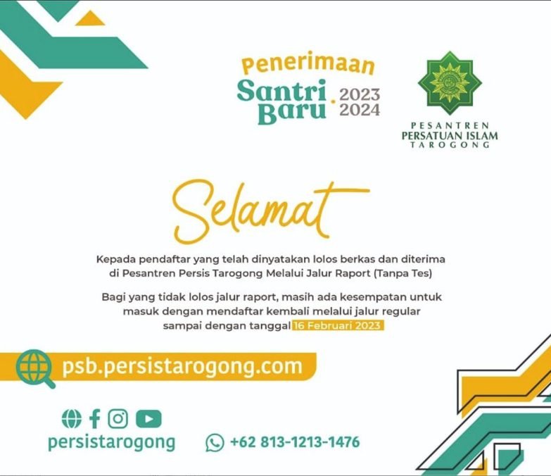 Pengumuman Hasil Seleksi PSB Jalur Rapot Tsanawiyah – Aliyah 2023-2024 Garut – Penerimaan Santri Baru Pesantren Persatuan Islam Tarogong Tahun Ajaran 2023-2024 resmi dibuka pada tanggal 1 Februari 2023 dan...